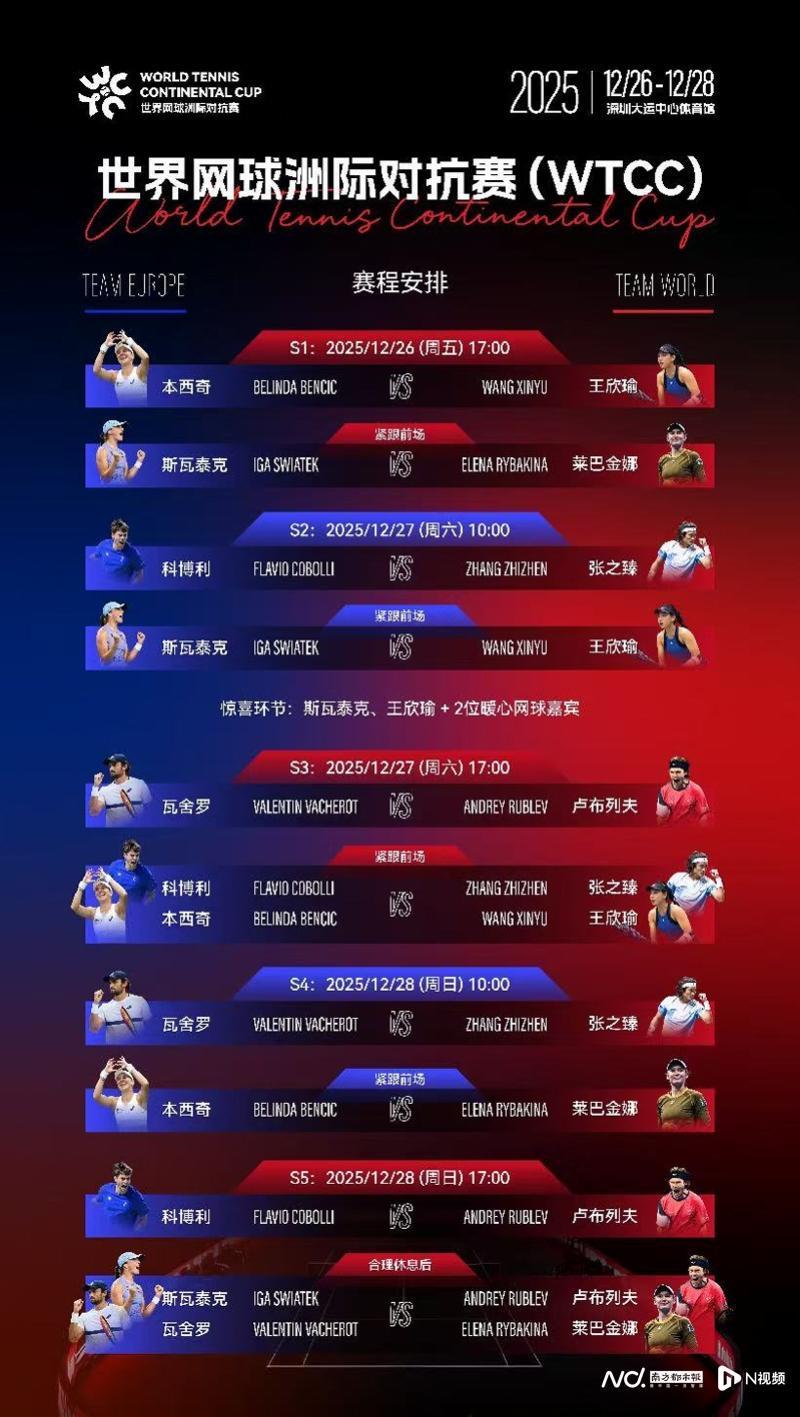 南都讯 记者汪雅云 12月26日,2025世界网球洲际对抗赛(WTCC)在深圳大运中心体育馆开幕。两位大满贯冠军斯瓦泰克、莱巴金娜领衔,中国网球明星王欣瑜、张之臻,以及卢布列夫、本西奇、科博利、瓦舍罗一众网坛实力悍将齐聚深圳。第一阶段的比赛中,斯瓦泰克领衔的欧洲队拔得头筹,以2比0暂时领先世界队。