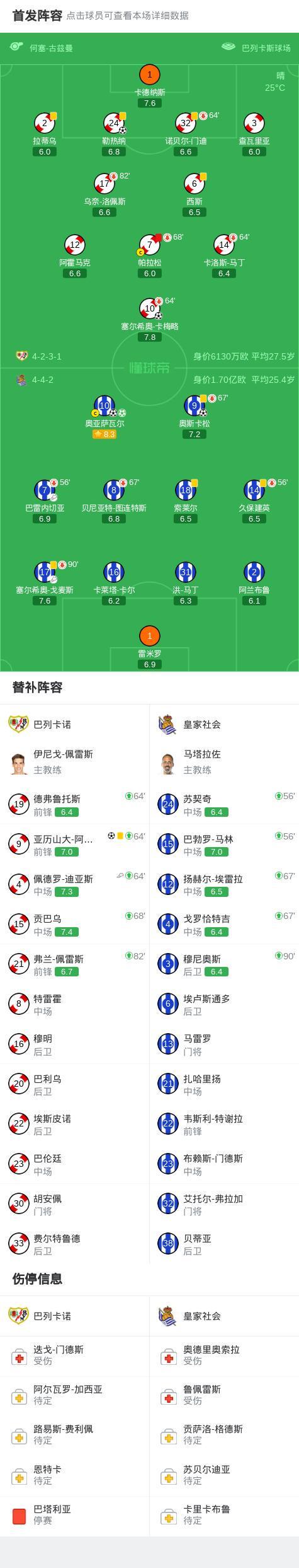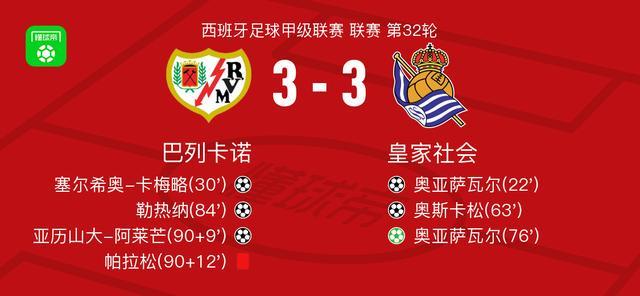 北京时间4月26日西班牙足球甲级联赛 联赛 第32轮,巴列卡诺主场对阵皇家社会。巴列卡诺塞尔希奥-卡梅略破门,勒热纳破门,亚历山大-阿莱芒破门。皇家社会奥亚萨瓦尔梅开二度,奥斯卡松破门。最终比分巴列卡诺 3-3 皇家社会。